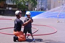 ホースを持って放水体験!