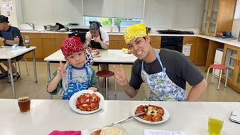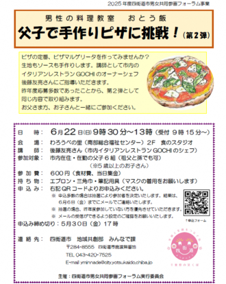 令和7年6月22日(日曜)、四街道市男女共同参画フォーラム事業として、男性の家庭参画の促進を目的に、「父子で手作りピザに挑戦!第2弾」を南部総合福祉センターわろうべの里で開催しました。