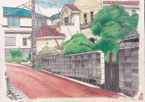 青桐のあった通りを、さらに前方に進むと坂道になる。その右側に、「お、これは何だ」と一瞬驚くような、ヨーロッパ風の家が姿を現す。赤い屋根瓦は、ポルトガルやスペインを思わす。正しくは南欧風と言うべきか。図右端の純和風の家と対照的な眺めだ。
