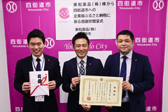 東和薬品株式会社様(本店所在地:大阪府門真市新橋町2番11号)から企業版ふるさと納税制度を活用して、いただいた寄附に対する感謝状贈呈式を行いました。