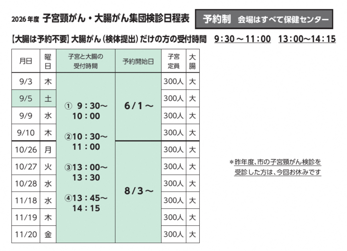 - 予約開始時期は検診実施月に応じて変わります。