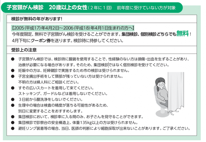 - 子宮頸がん検診では、検診時に膣鏡を使用することで、性経験のない人は損傷や出血を生ずることがあり、治療が必要となる場合がありますので、集団検診ではなく個別検診を受けてください。