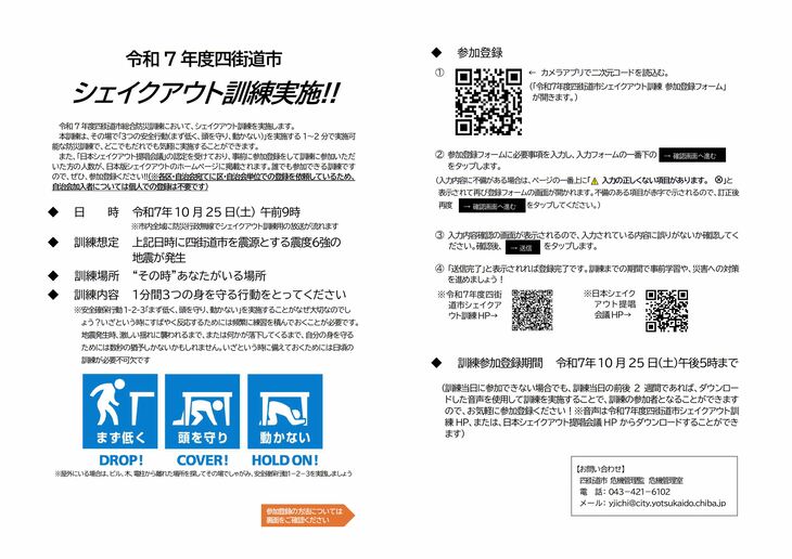 令和7年度四街道市総合防災訓練において、シェイクアウト訓練を実施します。本訓練は、「日本シェイクアウト提唱会議」の認定を受けており、事前に参加登録をして訓練に参加いただいた方の人数が、日本版シェイクアウトのホームページに掲載されます。実施時間は1~2分の誰でも参加できる訓練ですので、ぜひ、ご参加ください!